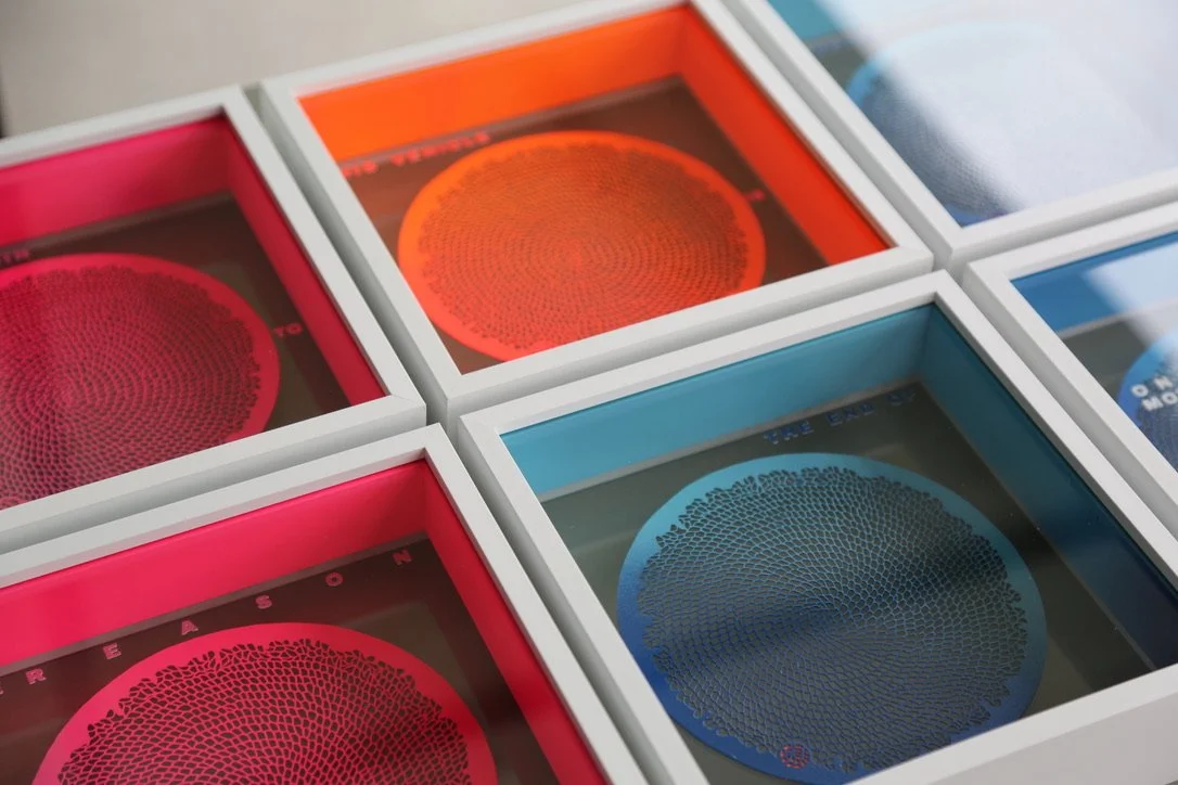 The Mini CHUO Line Collection brings together a series of intricate paper-cut works suspended within clear acrylic, their delicate structures casting subtle shadows that shift with the surrounding light. Each piece is set within a frame lined with vibrant, carefully matched colour, echoing the tones and rhythms of the artwork itself. Drawing on the visual language of the Tokyo subway and the density of urban life, where environmental questions are often overlooked, the works weave in subtle references to coral bleaching, using colour, form and symbolic motifs to mirror both the fragility of reef ecosystems and the pace of the city.